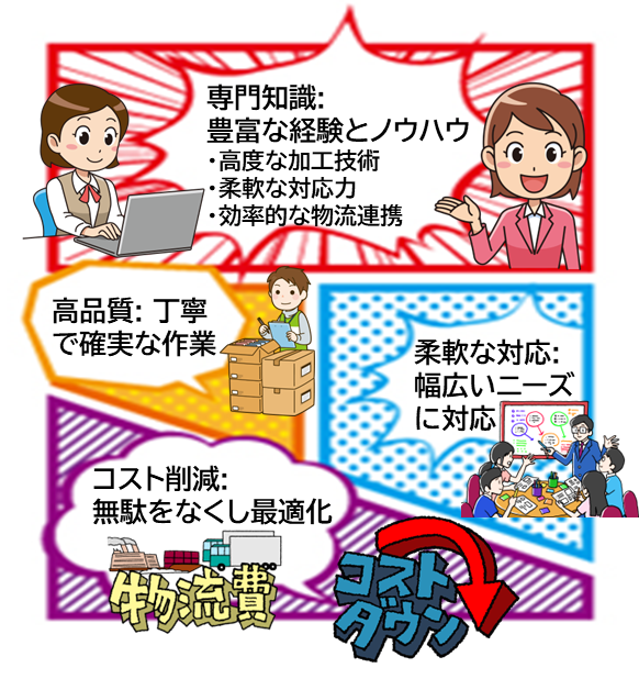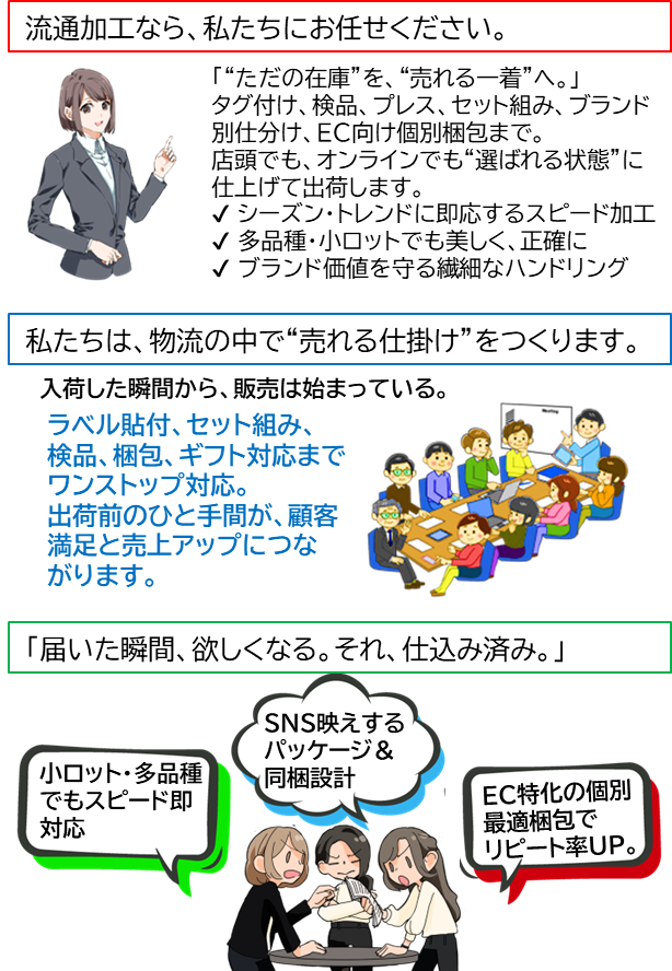 貴社のビジネスを円滑に進めるため高品質な流通加工サービスを提供します。
