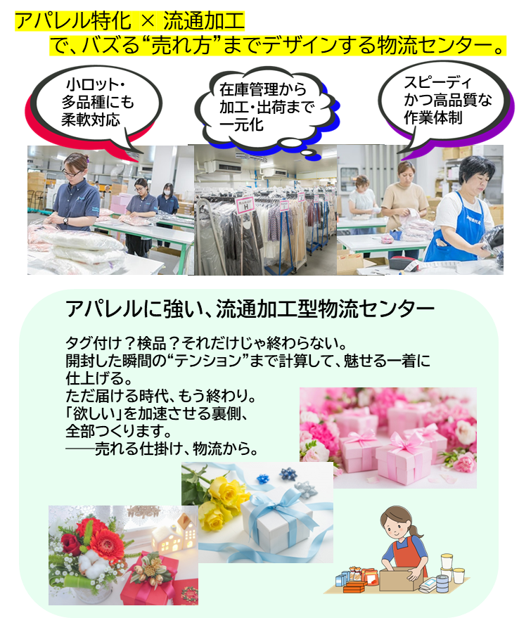 ただ運ぶだけでは終わらない。私たちの物流センターは、“流通加工”を強みに、商品の付加価値を最大化します。